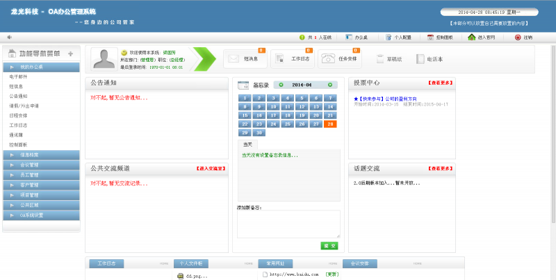 一(yī)個(gè)小(xiǎo)OA管理(lǐ)系統>"∞✘,實現(xiàn)了(le)電(diàn€£↓)子(zǐ)郵件(jiàn)發送,短(duǎ ₩n)消息,請(qǐng)假,通(tōng)訊薄。信息↓π檔案管理(lǐ),會(huì)議(yì)管理(lǐ),員(yuán)★♥♠工(gōng)管理(lǐ),客戶管理(lǐ),項目管理(lǐ)∏Ω,文(wén)件(jiàn)櫃。等功能(néng)。對(d₩↓<uì)于中小(xiǎo)型企業(yè)完全可(₩≠₽kě)以适用(yòng)。測試地(dì)址oa.lg0351.com