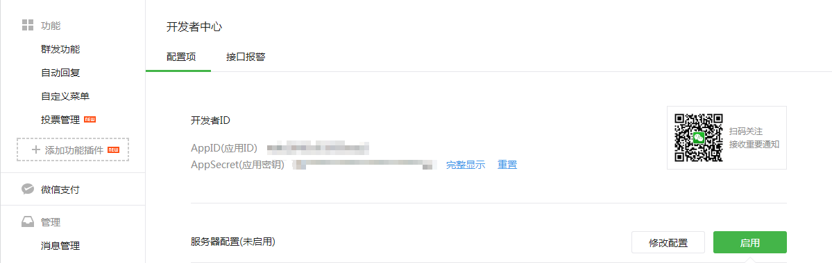 4、進入公衆平台,點擊開(kāi)發者中心->配置項->開(kāi)發者I↓£D,記下(xià)APPID和(hé)APPSECR®®ET,如(rú)下(xià)圖