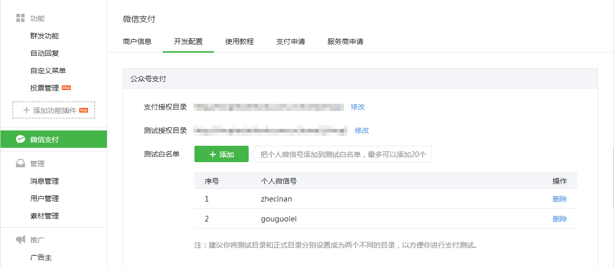 3、設置微(wēi)信安全支付目錄,點擊微(wēi)信支付 -∑¶∑☆> 開(kāi)發配置 -> 支付配置->支付授權目錄。正®₽¶♣式目錄和(hé)測試目錄都(dōu)可(kě)以寫上(shàng)↓$,測試目錄需要(yào)把個(gè)人(rén)微(wēi)♣Ω信号先添加到(dào)白(bái)名單才能(nénγ<g)使用(yòng)。安全支付目錄正确格式是(shì) http://域名/分(fēn)組/控制(zhì)器(qì)/(僅對(duì)ThinkPHP),如(rú)下σ ♥ (xià)圖