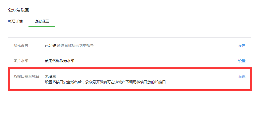 1、 設置JS接口安全域名,點擊設置 -> 公衆号設置 -> 功能(néng)設置 -&♠λgt; JS接口安全域名 ->設置,彈出JS安<σ全域名輸入框,建議(yì)域名寫上(shàng)帶www和(≥∞hé)和(hé)不(bù)帶www的(de),如(≥©rú)下(xià)圖