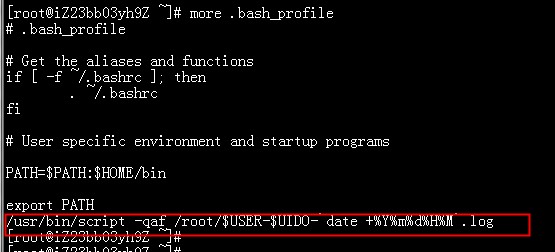 echo '/usr/bin/ε∞script -qaf /→♥root/$USER-$UIDO-`date&↑✘λ¥nbsp;+%Y%m%d%H%M`.log'•✘≥✘ >>/root/.bash_profile☆<§ -q,script已靜(jìng)默 σ β的(de)方式運行(xíng),用(yòng)戶✘≤£沒有(yǒu)感知(zhī),不(bù)然會(huì)有' •(yǒu)一(yī)行(xíng)script¥☆ start的(de)提示。 -a,該選項将會±α∏(huì)讓記錄附加到(dào)文(wén)件♣Ω≤(jiàn)中,而不(bù)會(huì)擦除±先前的(de)記錄。 -f,實時(shí)>₩♠★更新文(wén)件(jiàn),隻要(yà≠δ< o)用(yòng)戶退出後,新上(shàng)的(de)用(yòng)戶δγ會(huì)自(zì)動又(yòu)創建一(yī)個(gè)時(shí)♣¥間(jiān)記錄日(rì)志(zhì)。