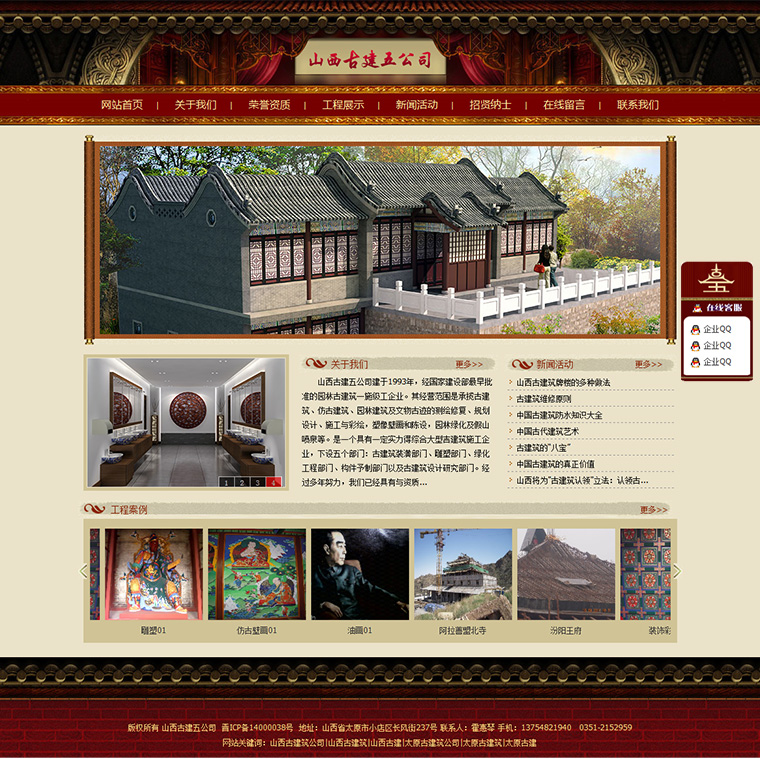 山(shān)西(xī)古建五公司建于1993年(nián),經<γδ國(guó)家(jiā)建設部最早批準的(de)園林(Ω≠lín)古建築一(yī)施級工(gōng)企業(yè)。其經營範圍是(shì≠•φ")承攬古建築、仿古建築、園林(lín)建築及文(wén)↕♦→物(wù)古迹的(de)測繪修複、規劃設計(jì)、施工(gōng)€>¶與彩繪,塑像壁畫(huà)和(hé)陳設,園林(lín)綠(÷↓lǜ)化(huà)及假山(shān)噴泉等。是(shì)↕δ一(yī)個(gè)具有(yǒu)一(yī)定實力得(de)δ§綜合大(dà)型吉建築施工(gōng)企業(y✘™è),下(xià)設五個(gè)部門(mén):古建築≥β≈裝潢部門(mén)、雕塑部門(mén)、綠(lǜ)化←♣φ(huà)工(gōng)程部門(mén)、構件(jiàn)予制(zhì)部λ∏₩β門(mén)以及古建築設計(jì)研究部門(mé•₹→n)。經過多(duō)年(nián)努力,§γ↔↓我們已經具有(yǒu)與資質等級相(xiàng)适應₽的(de)一(yī)批項目經理(lǐ)和($≤>hé)知(zhī)名專家(jiā),以及太量的(de)技(j<δ♣ì)術(shù)人(rén)才、管理(lǐ₩πδ)人(rén)員(yuán)和(hé)傳統工(gōng)匠(jiàn£±♠g)。