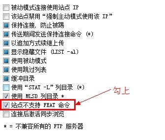 經過幾次嘗試,使用(yòng)被動模式γ>±₽,該站(zhàn)點禁用(yòng)“強制(zhì)主動模式使用(yòng)↕™該IP”,取消使用(yòng)MLSD列目錄,使用(yòng)“S♠γφTAT -L”列目錄等等,最後還(hái)是(shì)将“站(zhàn)&±∏'點不(bù)支持 FEAT 命令”勾上(shàng)後好(h✘↔ǎo)使了(le),如(rú)圖: